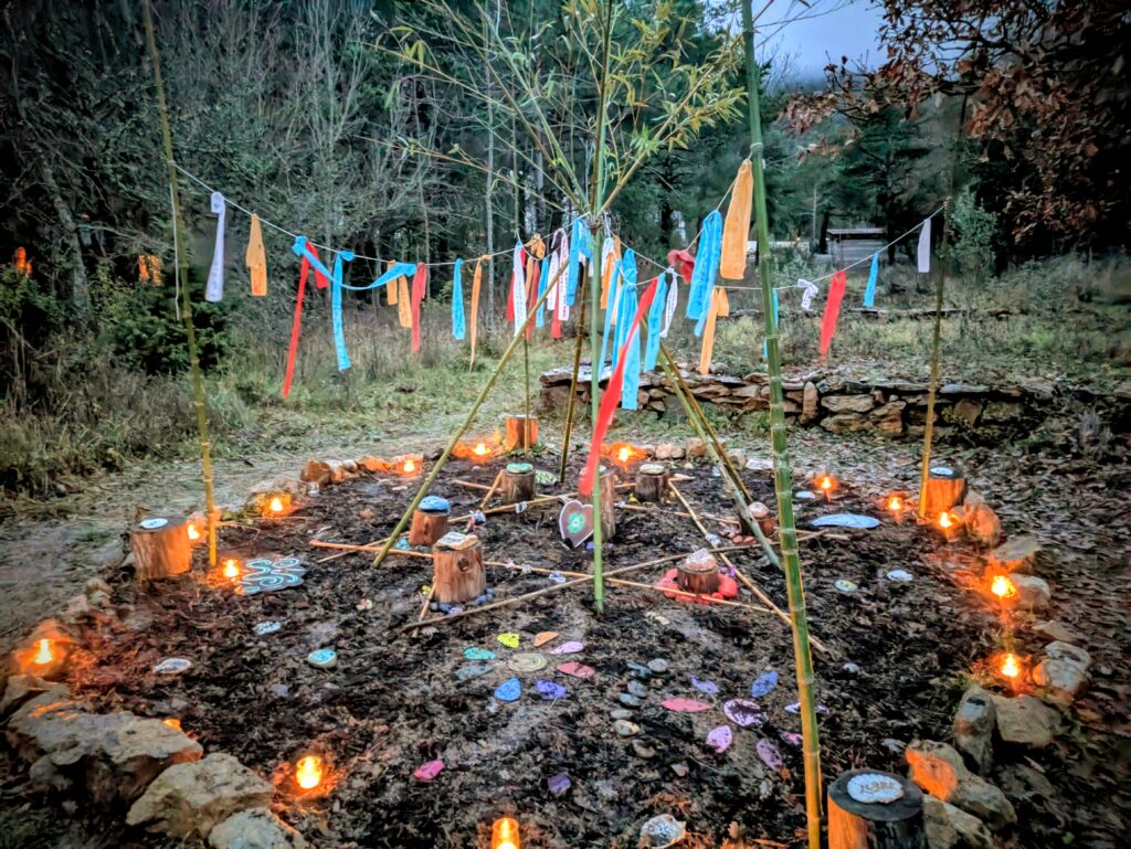 Et un grand terrain d’un hectare, sur lequel nous avons ancré le mandala avec les valeurs du collectif, un espace potager, des toilettes sèches, un accès direct à la colline….